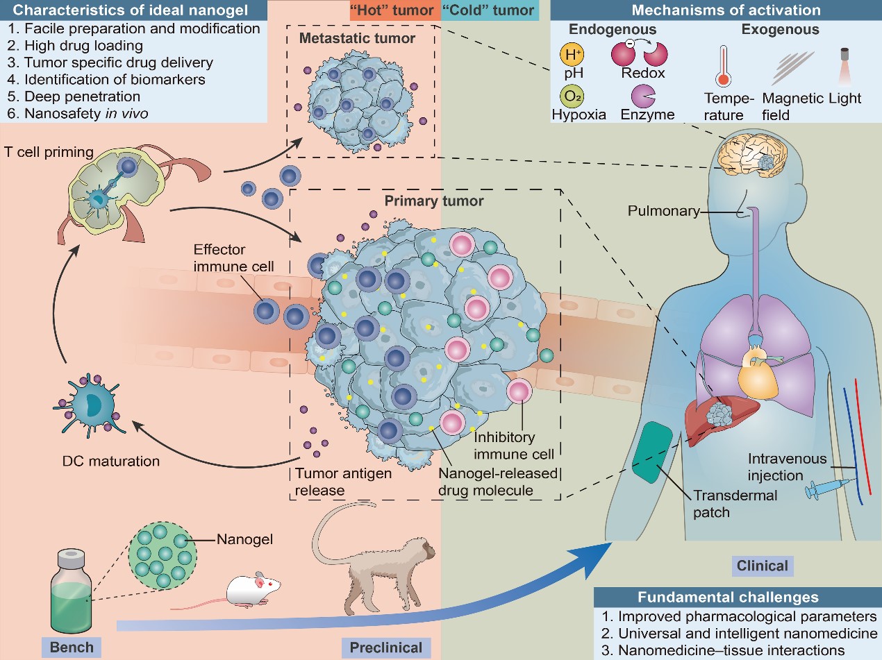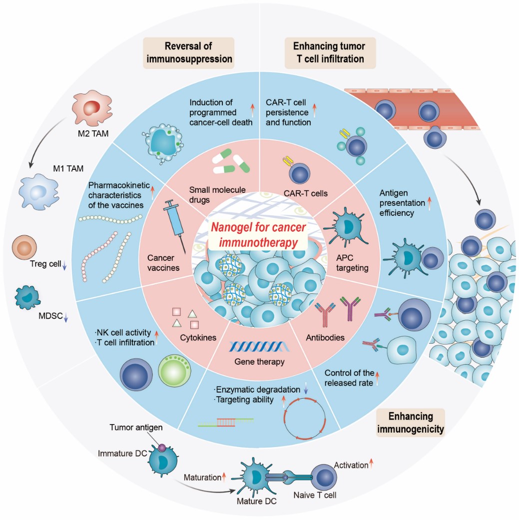 近年来,免疫治疗得到了前所未有的发展,逐渐成为临床癌症治疗的首选策略,但面临低应答率等科学问题。纳米免疫治疗策略可结合纳米技术和免疫治疗的双重优势,在提高药物的生物利用度,实现药物的肿瘤深穿透和调控肿瘤微环境等方面具有优势,是当前肿瘤免疫治疗中最具前景的研究方向之一。基于前期在该领域的研究工作,该论文从纳米凝胶的制备与分类出发,系统性阐述了基于纳米凝胶的免疫治疗的最新进展,包括免疫调节小分子药物(ICD/焦亡/铁死亡等诱导剂)、抗体、基因、细胞因子等递送以及在抗原递呈细胞、肿瘤疫苗、CAR -T细胞治疗等方面的应用,并对该领域存在的挑战与未来发展趋势进行了系统性分析。