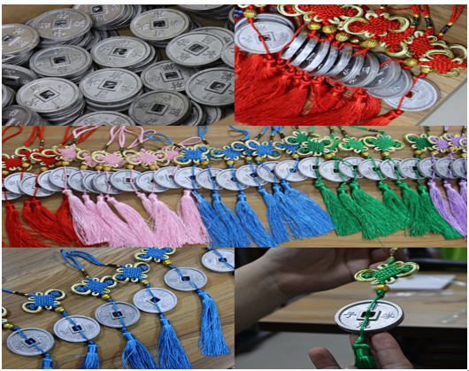 5月30日下午,学院又组织毕业生对制作清洗好的纪念币进行装饰、美化,大家把各种五颜六色的装饰穗进行整理,经过穿绳、打结、固定、裁剪一套固定的模式,上百次的重复,几个小时的努力,几十名毕业生以流水线的方式顺利完成了几百枚纪念币的装饰。至此,一串串正反面分别印着“必一运动”、“材能学子”字样的精美的毕业纪念币吊坠诞生。