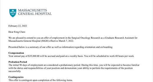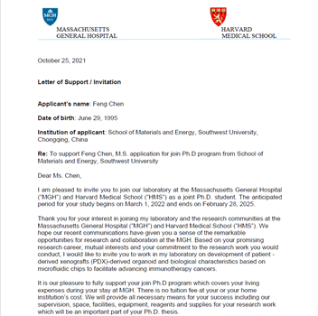 2021年4月陈凤同学申请了哈佛大学医学院麻省总医院教授Dr. Xinhui Wang在其学校的官方网站上发布的研究助理(Graduate Research Assistant)的职位,同年12月第二次官网申请、面试,经过Dr. Xinhui Wang的面试与全球多位科研申请人的角逐,哈佛医学院麻省总医院的资料审核、背景调查等一系列的过关斩将,最终于2022年2月收到了哈佛医学院麻省总医院的录取通知函和Dr. Xinhui Wang的邀请信。
