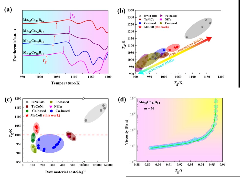 图2: Mo-Co-B块体金属玻璃的玻璃转变和晶化行为;典型高温块体金属玻璃在热稳定性、成本方面的对比,