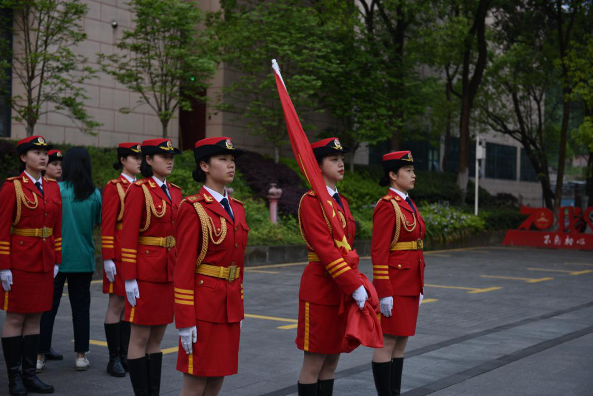 升旗仪式开始前,必一运动女子国旗班就已在升旗台前集合完毕。她们身着红色军礼服,脚下发出整齐划一的踏步声,一遍遍地进行着最后的训练。