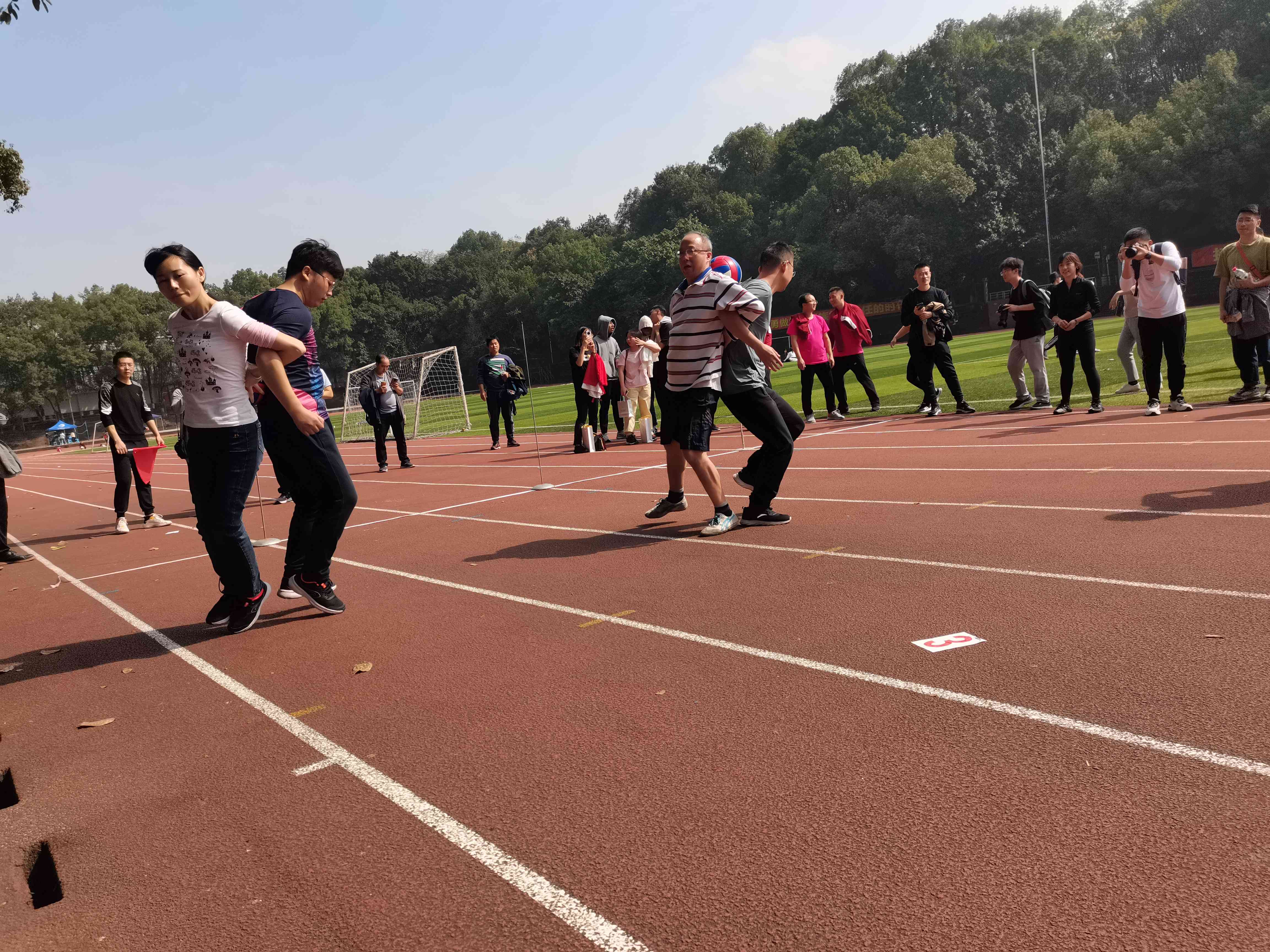 最后是螃蟹赛跑比赛,教师们手挽手,肩并肩,步伐一致地向着终点前进,转眼间就已经抵达了终点。