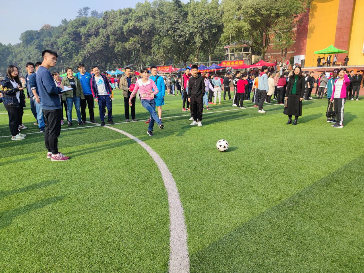 然后进行的是男女混合踢足球比赛。个个教师脚下生风,精准射门,球进门框,教师们为自己的进球欢呼喝彩。