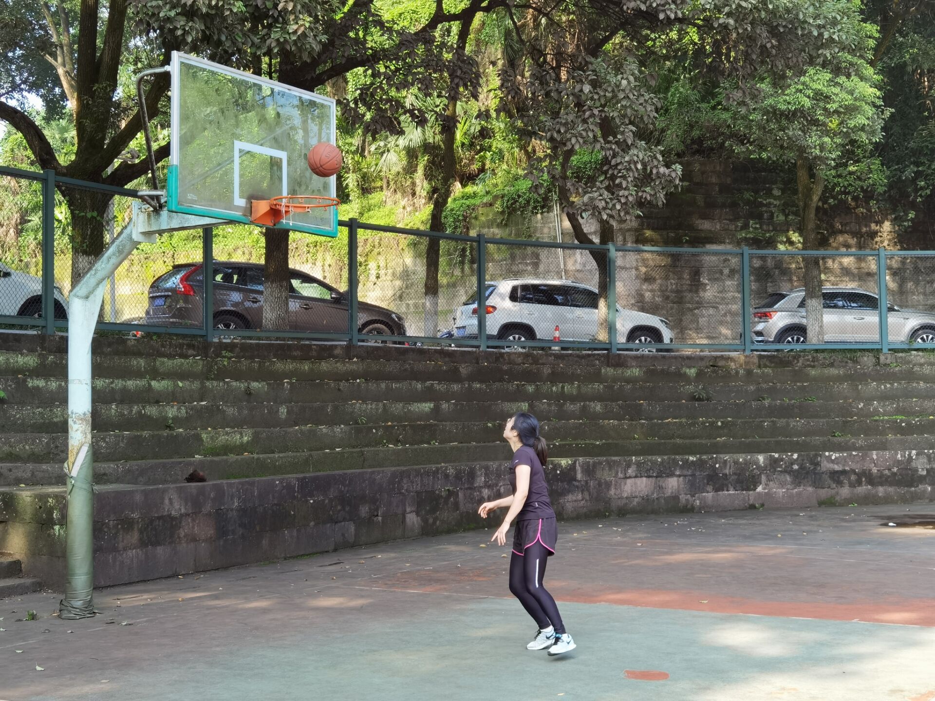 其次是男女混合运球上篮比赛,教师们运球自如,配合默契,篮球空心入网,入网声清新悦耳。