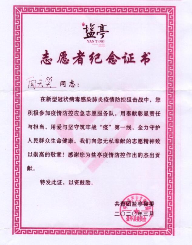 奋斗的青春,战疫的身影 ——盐亭县巨龙镇社区致信感谢公司志愿者