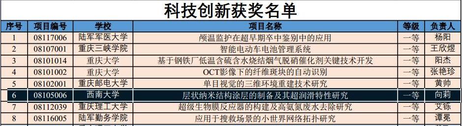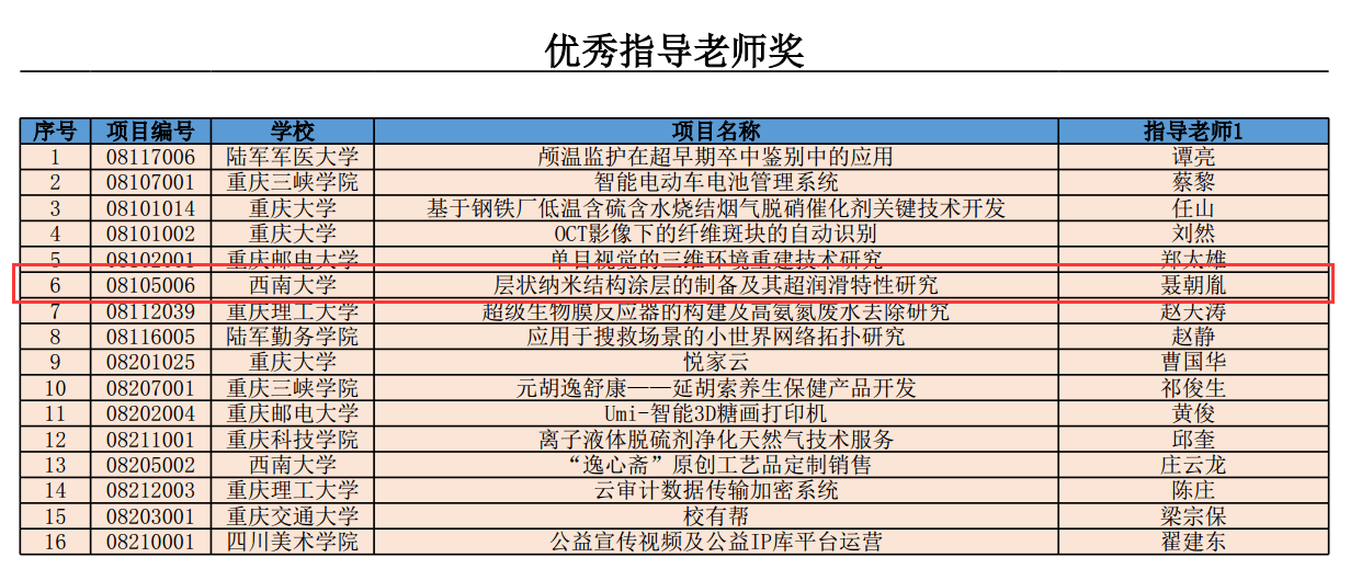 近日,我部聂朝胤教授课题组2017级研究生向莉同学领衔的“层状纳米结构涂层的制备及其超润滑特性研究”项目,在由重庆市教育委员会主办、重庆大学研究生院承办的重庆市第八届“科慧杯”研究生创新创业大赛中荣获一等奖。该项目组成员还包括本学部研究生徐雨生、沈倩倩、李洋、范莉。该项目通过层层筛选、评审和答辩,最终从509支参赛团队中脱颖而出,获得科技创新组一等奖,聂朝胤教授同时获得优秀指导老师奖。