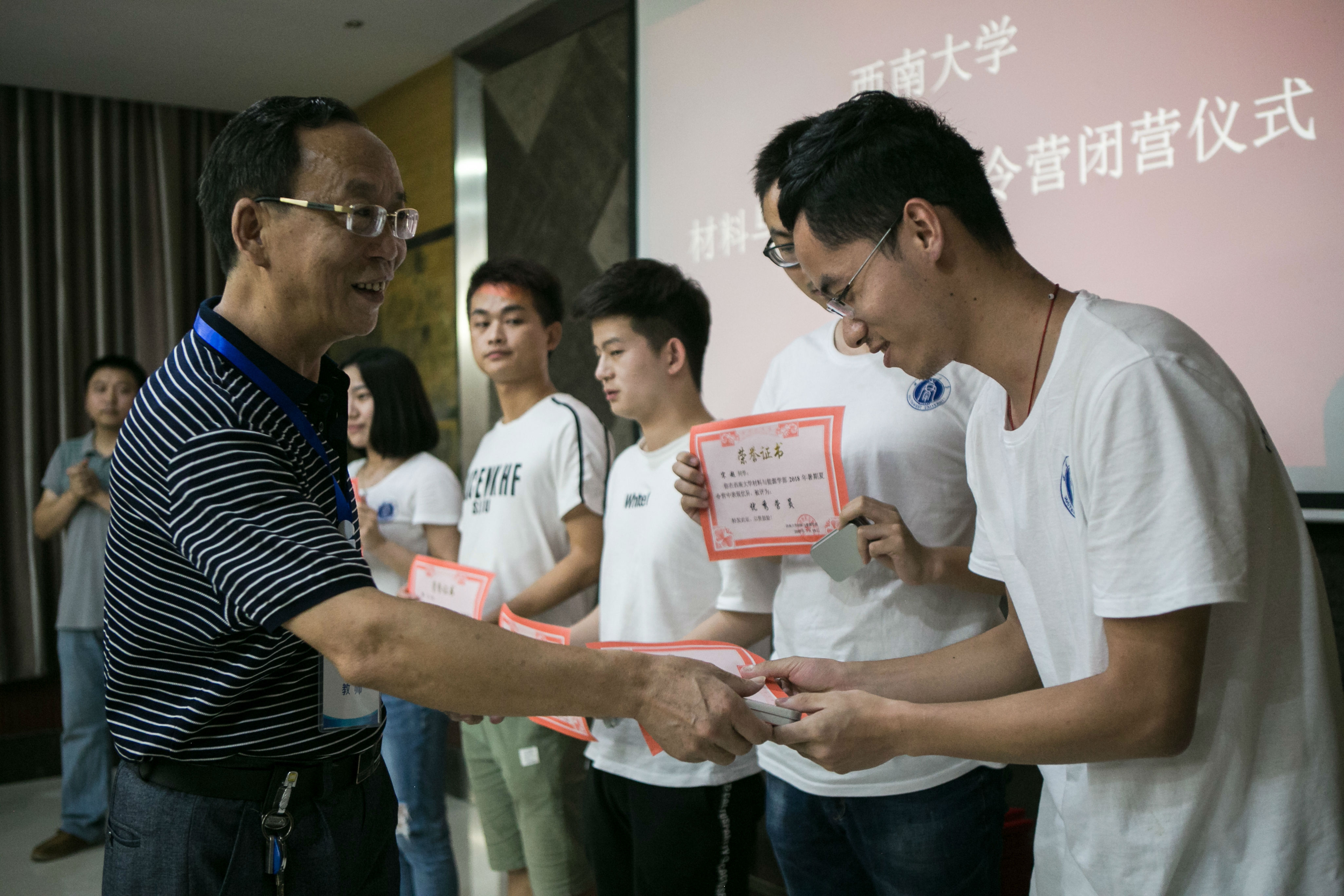 闭幕式初始,徐立群副教授致闭幕词,总结了营员们在此次夏令营活动中的表现情况。随后,杨书记为本次夏令营的优秀志愿者以及优秀营员进行了颁奖,并为每一位优秀营员颁发了一份精美的纪念品。颁奖仪式过后,徐立群副教授针对参加此次夏令营活动的营员们提出了以下三个期望:第一,希望营员们通过此次夏令营能够有所收获。第二,重庆近期高温炎热,希望各位营员提高安全意识,注意防暑。第三,鼓励各位营员在接下来的一年中努力学习、坚持梦想并在来年成为材料与能源学部的一员。最后,杨书记幽默风趣地总结了重庆的天气特点,再次强调了安全意识,尤其强调营员在返程途中注意安全。