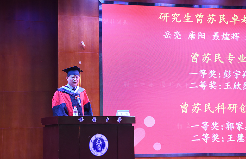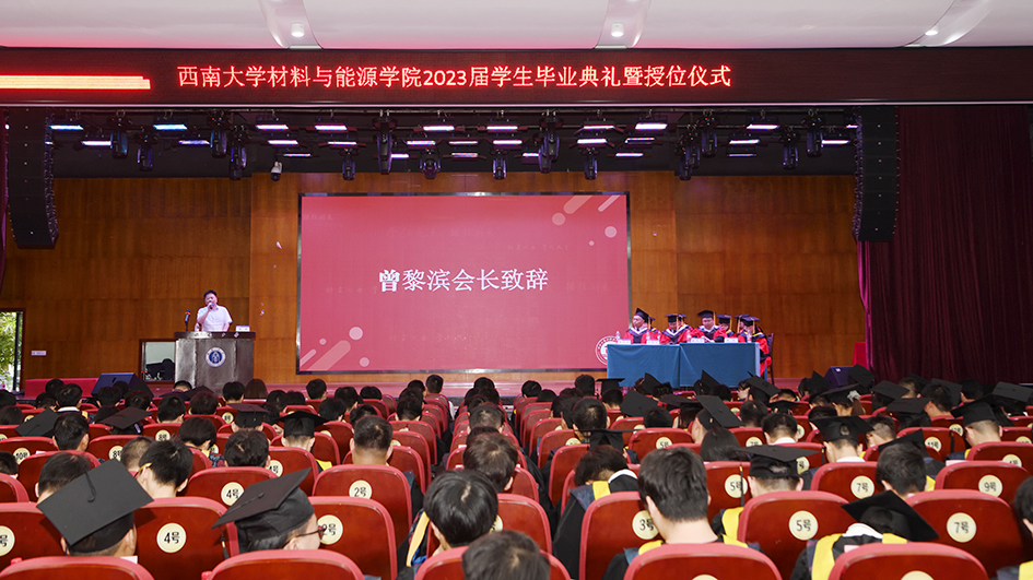 毕业典礼在全场高唱的国歌声中拉开序幕。首先,副经理郭胜锋教授宣读了《关于2023届本科生毕(结)业的决定》、《关于2023届研究生毕(结)业的决定》,副经理徐立群教授宣读了《关于授予2023届本科生学位的决定》、《关于授予2023届研究生学位的决定》;接着进行了毕业证颁发仪式和学位授予仪式,毕业生们穿着学位服,逐一上台接受学术委员会主任康跃军教授的拨穗授位,并从学术委员会委员导师手中庄严地接过毕业证书、学位证书和毕业礼物,逐一授位后与康教授进行了合影留念;接着,表彰了“重庆市优秀大学毕业生”、“必一运动优秀毕业论文获得者”,由党委书记梁武同志宣读了获奖名单。其中最令人激动的是,现场还表彰了学院今年评选的“曾苏民奖学金获得者”,并邀请到曾苏民院士之子、现任中国铝业协会会长、西加铝业股份有限公司董事长的曾黎滨会长为“曾苏民卓越科研成果奖学金”、“曾苏民专业奖学金”、“曾苏民科技创新奖学金”获得者分别进行了颁奖,最后,曾会长还在典礼上致辞,对获奖同学表达了祝贺。