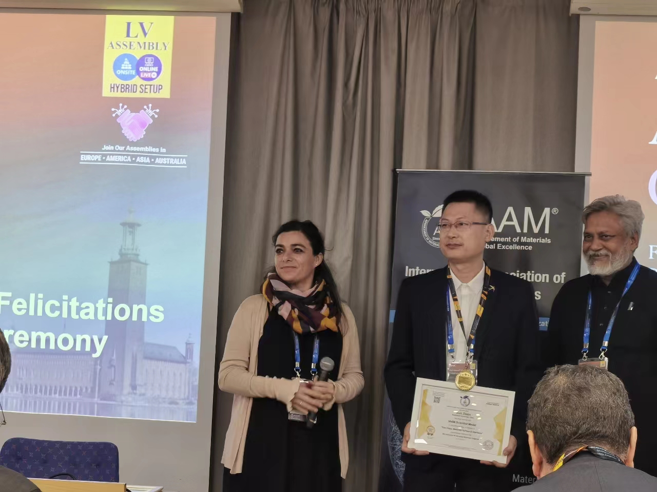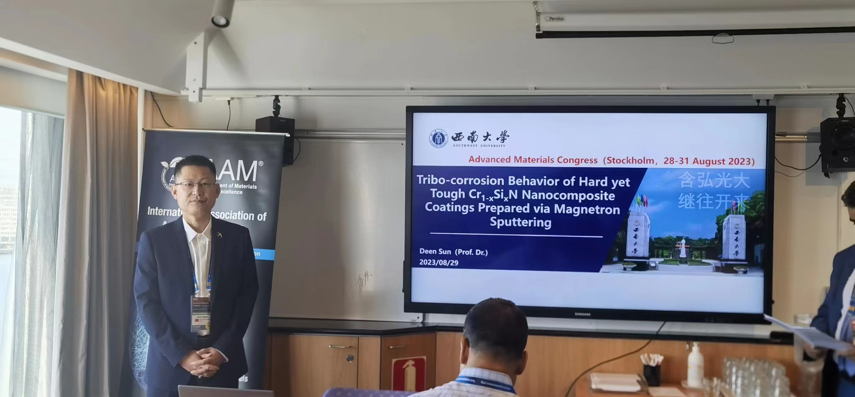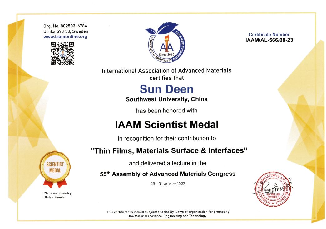 2023年8月28-31日,在瑞典斯德哥尔摩召开的先进材料大会(Advanced Materials Congress)上,孙德恩教授应邀以“Tribo-corrosion behavior of hard yet tough Cr1-xSixN nanocomposite coatings prepared via magnetron sputtering”为题做主题报告,并获得国际先进材料协会(International Association of Advanced Materials, IAAM)颁发的2023年度科学家奖(IAAM Scientist Medal),以表彰其在薄膜、材料表界面研究领域取得的突出成就。