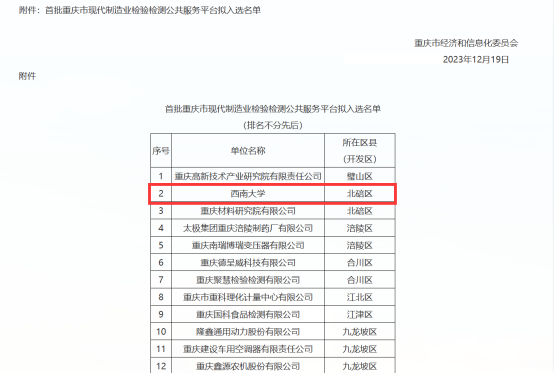 12月20日,重庆市经济信息委发布了“关于首批重庆市现代制造业检验检测公共服务平台拟入选名单”公示,经平台自主申报、区县初审、专家评审等程序后,必一运动成功入选首批重庆市现代制造业检验检测公共服务平台公示名单。该平台由必一运动官网牵头申报并整合学校分析测试中心资源,致力于为制造业提供高水平、高质量的检验检测服务。