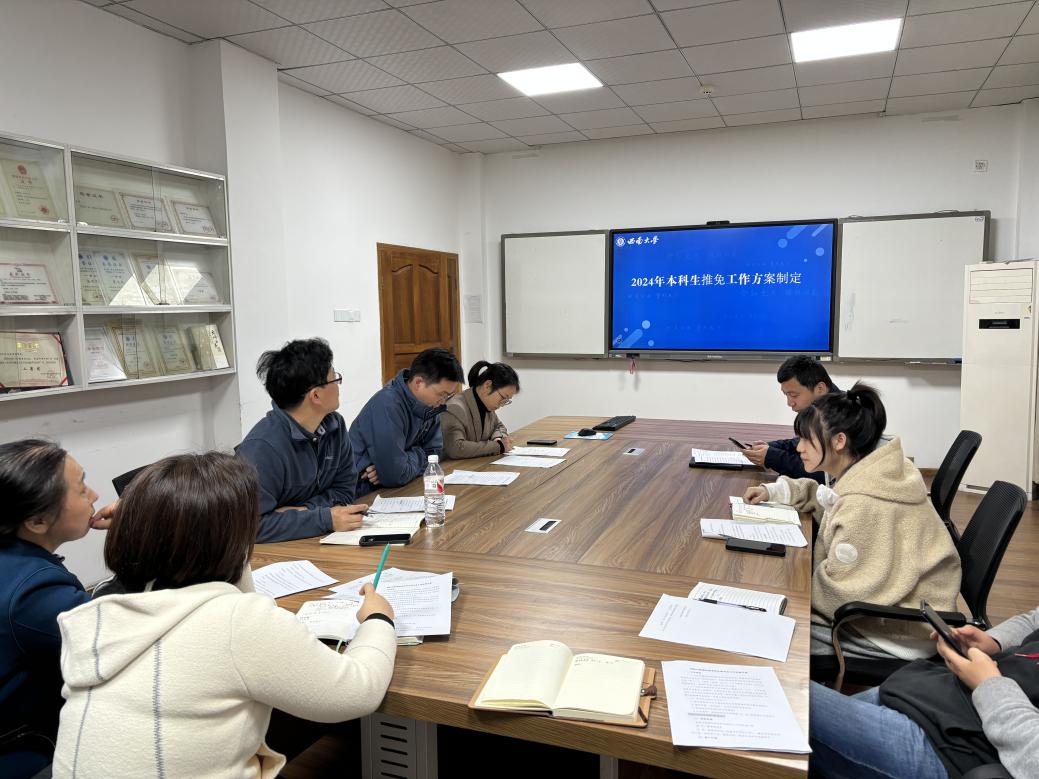 为进一步规范学院推荐优秀应届本科毕业生免试攻读硕士学位研究生工作,加大拔尖创新人才选拔力度、完善硕士研究生招生多元录取机制,郭胜锋副经理同各位教师针对2024年研究生推免文件细则各个环节展开了细致深入的探讨,尤其针对推免生的基本要求、可加分项、推免流程等内容。推免工作不仅应注重员工的学习成绩,同时也应注重员工个人的品德发展,在今年的推免文件中,着重强调了对于员工的思想政治考察、综合素质考察,这也是坚持立德树人、五育并举的教育理念的深刻体现。同时,老师们提出,在学院日常教学工作中,各位教师也要注重自身的专业素质提升和师德师风建设,培养德智体美劳的员工人才。