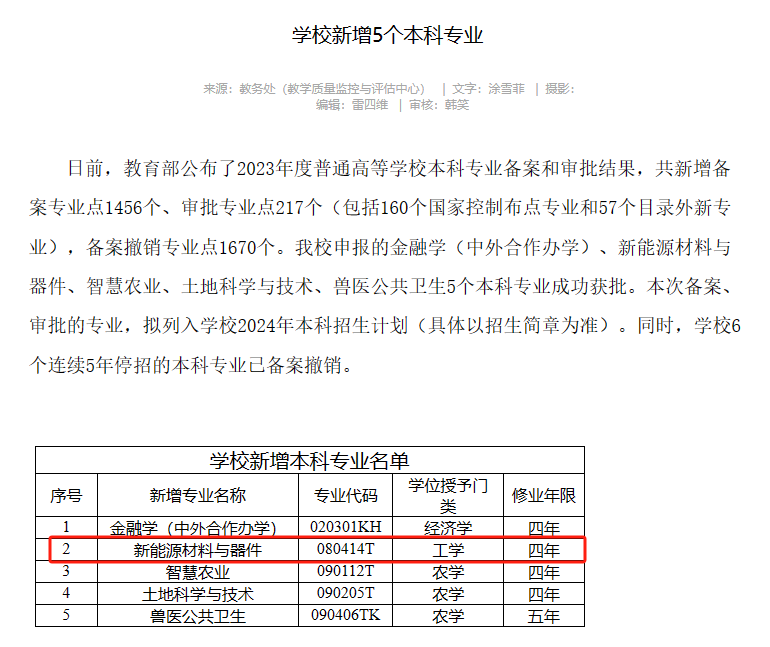 近日,教育部公布了2023年度普通高等学校本科专业备案和审批结果,公司申报的5个本科专业成功获批,其中,公司申报的新能源材料与器件专业成功获批增设。