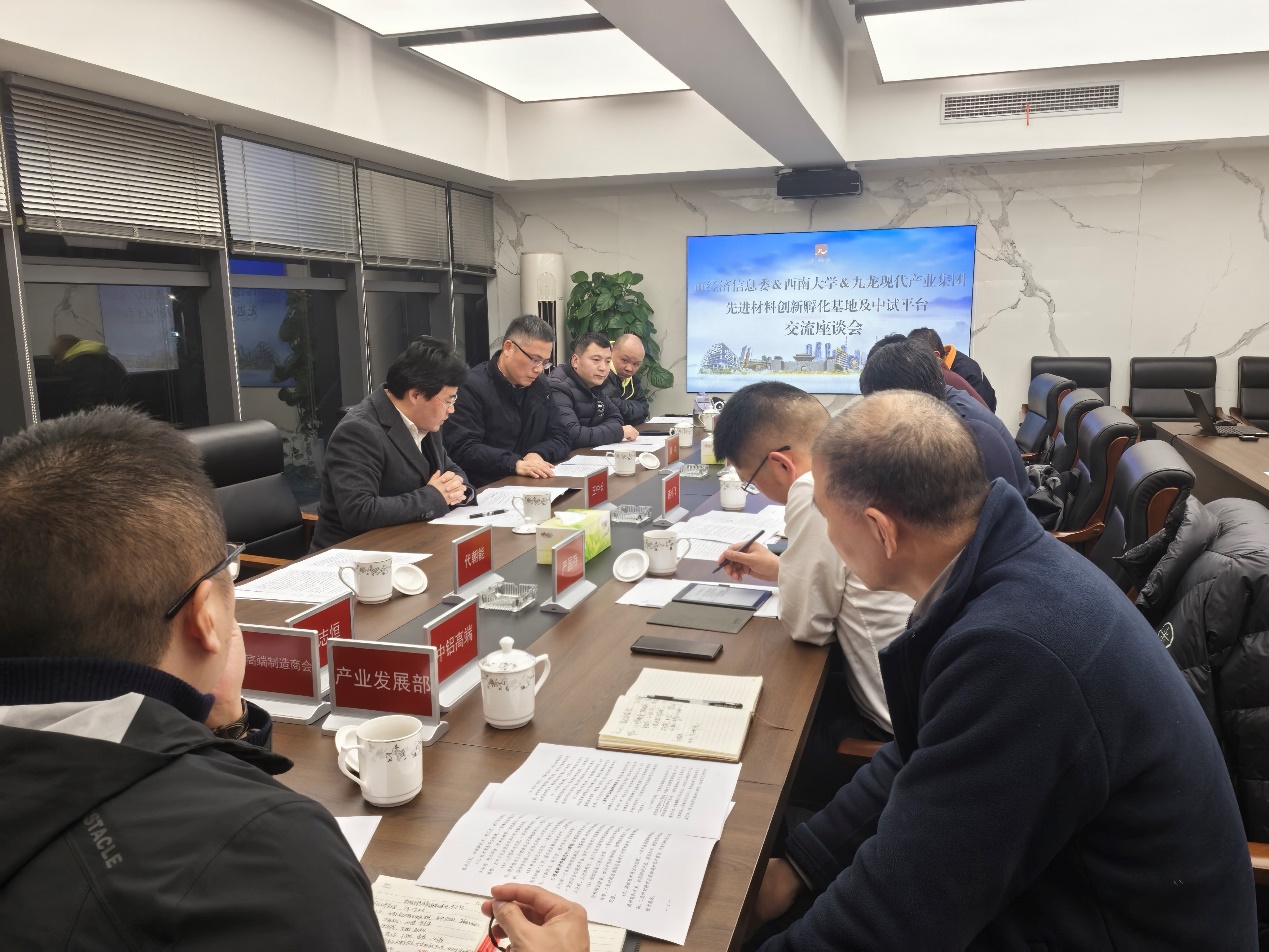12月19日,公司党委书记梁武、经理王中长、副经理郭胜锋一行赴重庆九龙现代产业集团洽谈新材料中试平台建设工作。重庆市经信委材料处张博处长、柴美厚三级调研员,重庆九龙现代产业集团党委书记、董事长蒋小飞和副总经理严国存,重庆国创轻合金研究院副总经理王彬及中铝高端有关人员参加座谈交流。