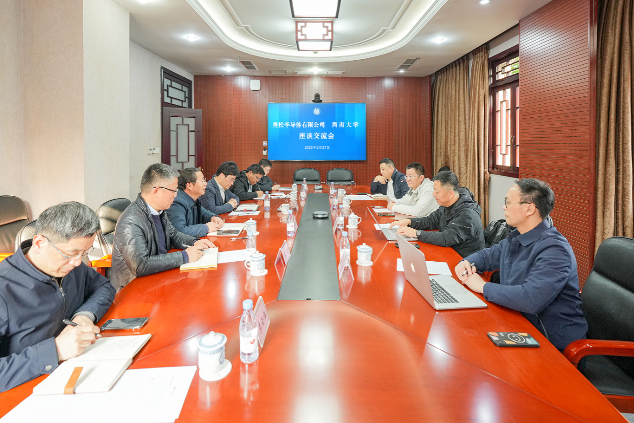 会见结束后,张宾一行与学校有关单位进行了交流座谈,座谈会由公司党委书记梁武主持,双方围绕技术研发、人才培养、平台共建、产学研协同创新等内容展开深入交流。奥松半导体有关负责人,学校研究生院、科学技术发展研究院、社会服务处、王中长经理参加座谈交流。