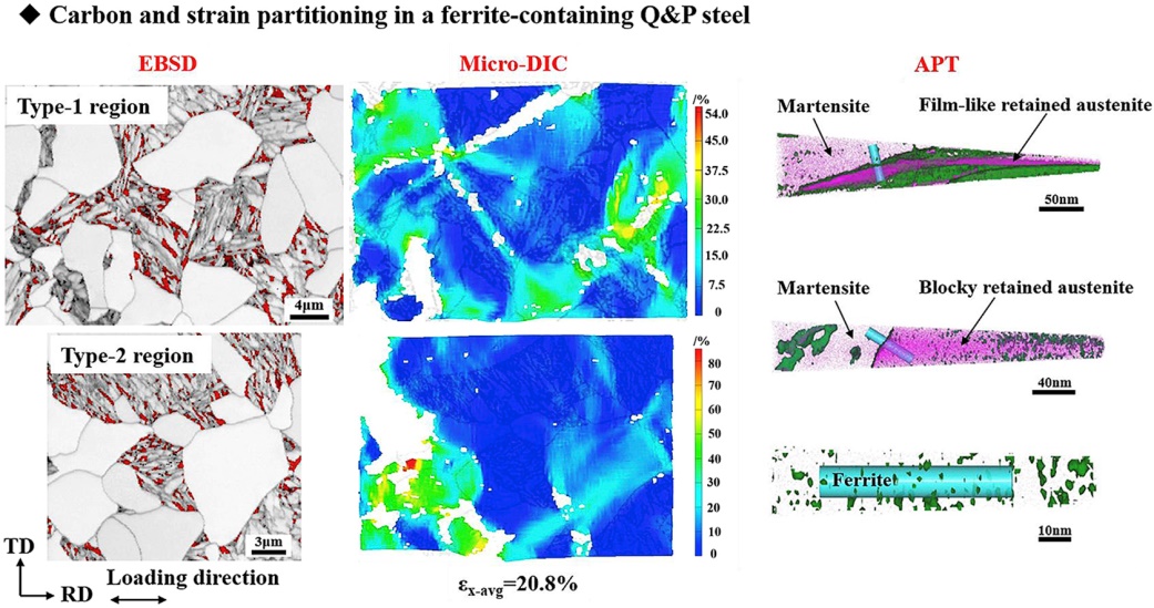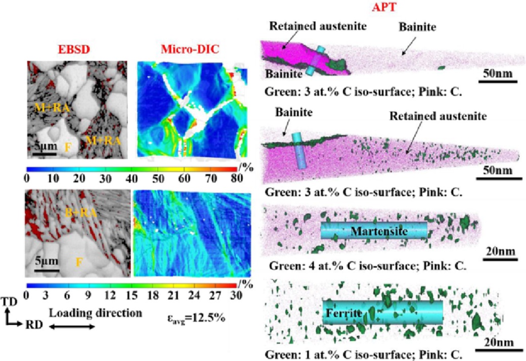 为提高含铁素体型Q&P钢中TRIP增塑的有效性并降低软硬相界面的裂纹敏感性,公司新金属功能材料团队谭小东老师等与德国Max-Planck-Institut für Eisenforschung GmbH (MPIE) Dierk Raabe教授、Dirk Ponge博士、逯文君博士以及东北大学轧制技术及连轧自动化国家重点实验室(RAL)吴迪教授、许云波教授等开展合作研究。运用准原位拉伸与微观数字图像相关(digital image correlation, DIC)及电子背散射衍射(electron back-scattered diffraction, EBSD)技术相结合的方法,重点研究了含铁素体型Q&P钢及TRIP钢中软硬相应变配分与TRIP效应和强塑性之间的关系;利用原子探针层析(atom probe tomography, APT)技术对各相间的碳配分展开了系统定量研究。在系统研究基础上提出了基于碳配分及应变配分控制的含铁素体型Q&P钢组织性能调控策略。相关研究结果已发表在《Acta Materialia》、《Materials Science and Engineering:A》等金属材料领域权威学术期刊上。上述研究工作得到了重庆市基础研究与前沿探索专项(重庆市自然科学基金)、必一运动博士启动基金等项目的资助。
