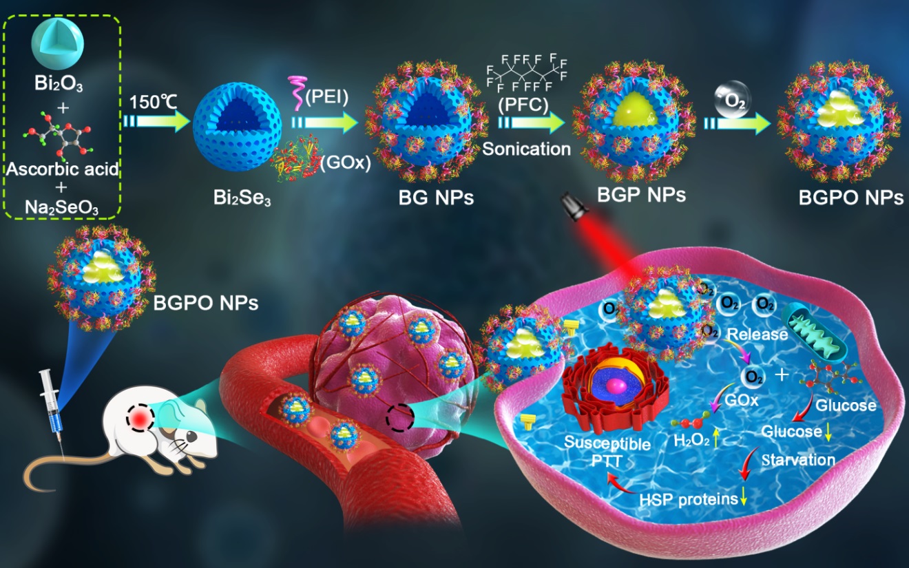 与正常细胞相比,肿瘤细胞更加过度依赖葡萄糖介导的能量供应,因此通过降低肿瘤区域的葡萄糖水平,可以有效抑制向肿瘤细胞的能量输送,从而实现对肿瘤的“饥饿治疗”。葡萄糖氧化酶(GOx)可以有效地消耗肿瘤组织内葡萄糖,但其效率往往受限于肿瘤组织乏氧微环境,酶自身稳定性不足以及缺乏有效的辅助治疗手段。因此,亟待开发一类高效的诊疗平台用于逆转肿瘤局部乏氧环境并同时提高GOx的酶活性。另一方面 ,光热治疗被证明可以有效实现近红外光诱发的肿瘤消融,但局部光热会上调细胞内的热激蛋白(HSP)表达,并启动细胞自卫机制,从而降低了光热治疗的预期疗效。