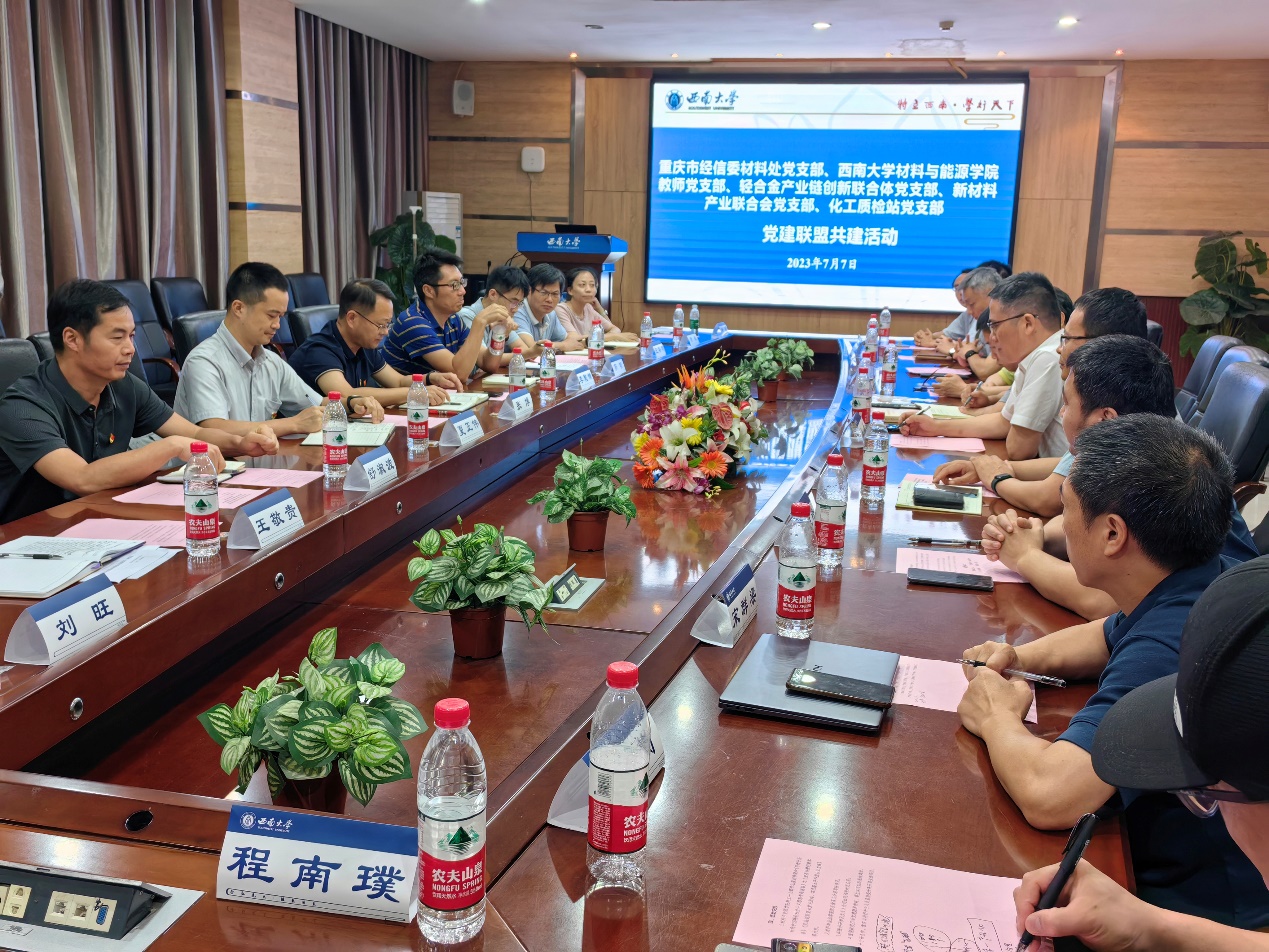 为深入开展学习贯彻习近平新时代中国特色社会主义思想主题教育,落实新时代党的建设总要求,以高质量党建推动政行院企深度合作交流,更好服务区域经济社会发展,构建政校行企协同育人新格局,7月7日下午,学院党委与重庆市经济和信息化委员会材料工业处党支部、轻合金产业链创新联合体党支部、新材料产业联合会党支部、化工质检站党支部联合开展“以学促干,政行院企共建谋发展”党建联盟共建活动。公司党委书记梁武、经理徐茂文、副经理徐立群、副经理郭胜锋、各科研团队负责人、教师第一党支部党员,市经信委材料工业处处长兼支部书记张博、副处长李乾锋、副处长夏正伟及支部党员,新材料产业联合会秘书长王敬贵,轻合金产业链创新联合体秘书长刘旺,重庆化工质检站站长兼支部书记王裕明、副站长席敏等30余人参加活动,活动由梁武主持。