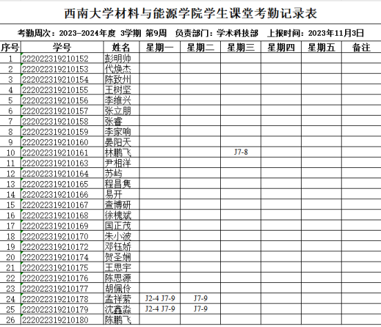 22级6班第9周考勤表