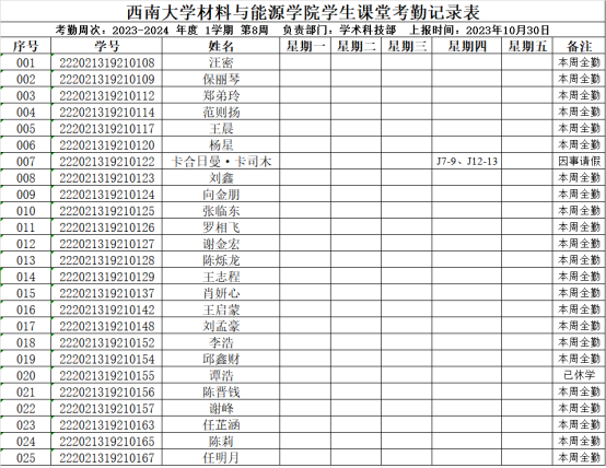 21级金属材料3班第8周考勤表